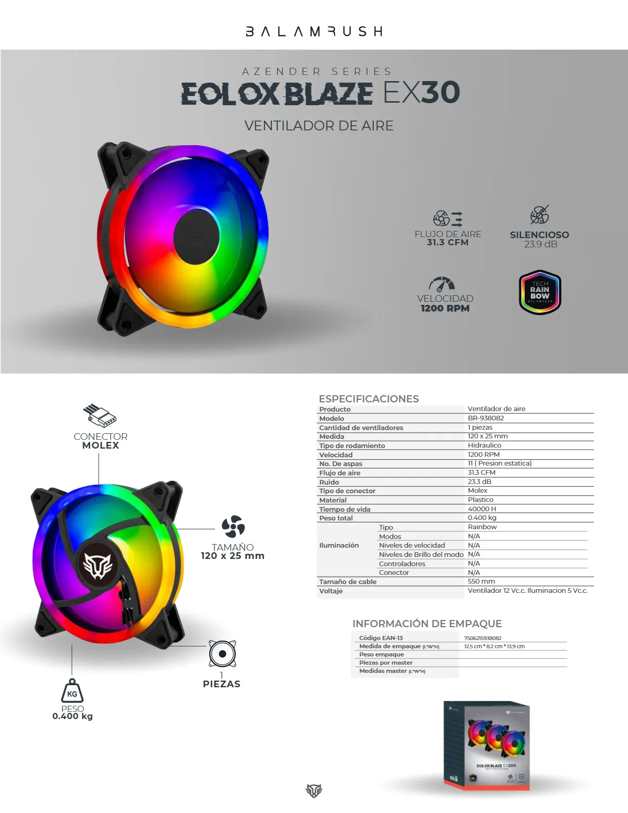 Kit De Tres Ventiladores BALAM RUSH EOLOX BLAZE EX30KW RGB / 120MM / 1200 RPM / 31.3 Cfm / 23.3 dBA / Conector Molex / Blanco