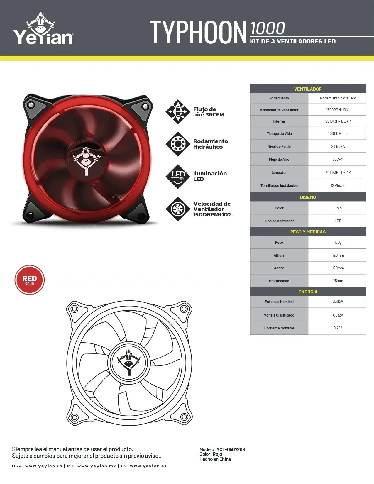 KIT de Ventiladores Gamer YEYIAN TYPHOON / 120MM / Led Rojo / 1500 RPM / YCT-050720R
