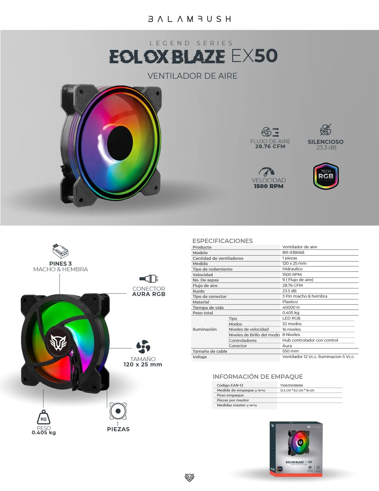 Ventilador BALAM RUSH EOLOX BLAZE EX50 / 120MM / RGB / 1500 RPM / 28.76 CFM / 23.3 dBA / 4Pin 12V, 3Pin 5V / Negro