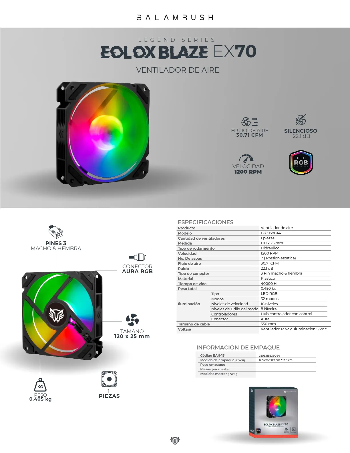 Ventilador BALAM RUSH EOLOX BLAZE EX70 / 120MM / RGB / 1200 RPM / 30.71 CFM / 22.1 dBA / 4Pin 12V, 3Pin 5V / Negro