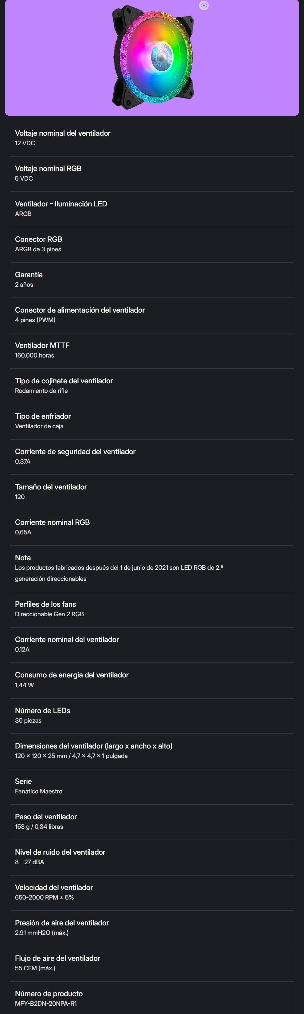 Sé el primero en valorar “Ventilador COOLER MASTER MASTERFAN MF120 PRISMATIC / 120MM / RGB / 2000 RPM / 55 CFM / 27 dBA / 4Pin 12V, 3Pin 5V / Negro”