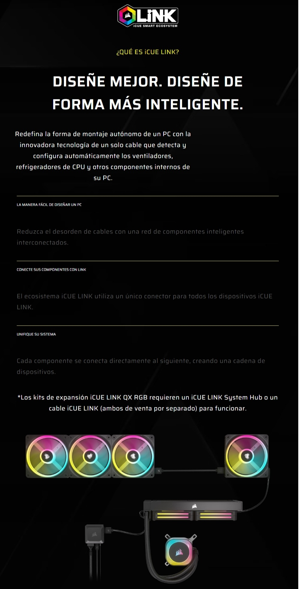 Añada un kit de expansión de ventilador PWM CORSAIR iCUE LINK QX120 RGB 120 mm a su sistema para obtener aún más iluminación con cuatro zonas de iluminación distintas. Se requiere concentrador del sistema iCUE LINK (de venta por separado).