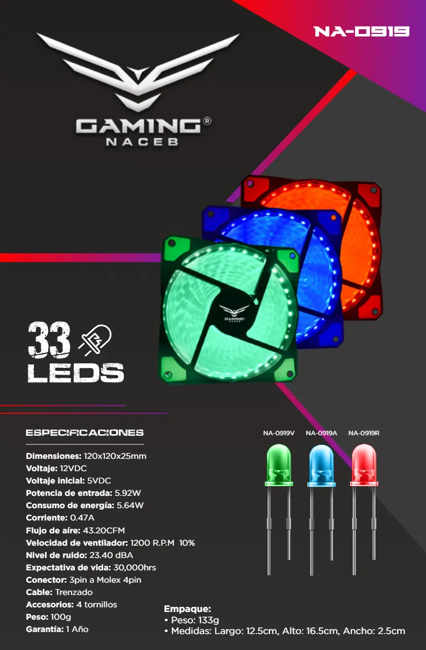 Ventilador NACEB TECHNOLOGY NA-0919A / 120 Mm / 33 LEDS / 1200 RPM / 43.20 CFM / 23.40 dBA / 3Pin 12V, 3Pin 5V ARGB / Azul Con Negro
