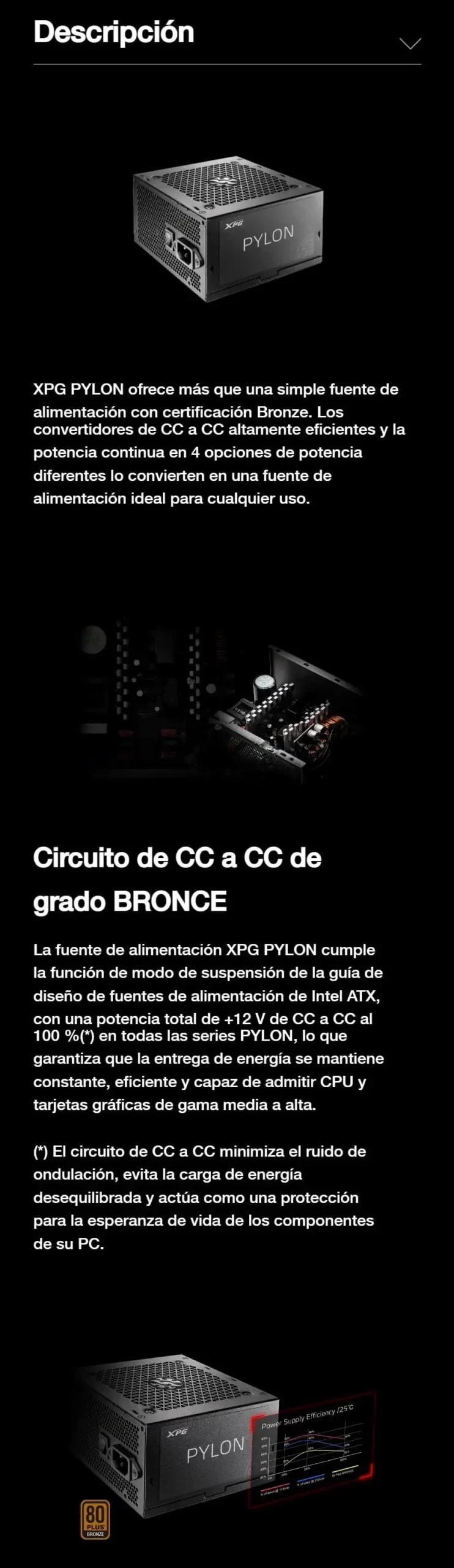 XPG PYLON ofrece más que una simple fuente de alimentación con certificación Bronze. Los convertidores de CC a CC altamente eficientes y la potencia continu…
