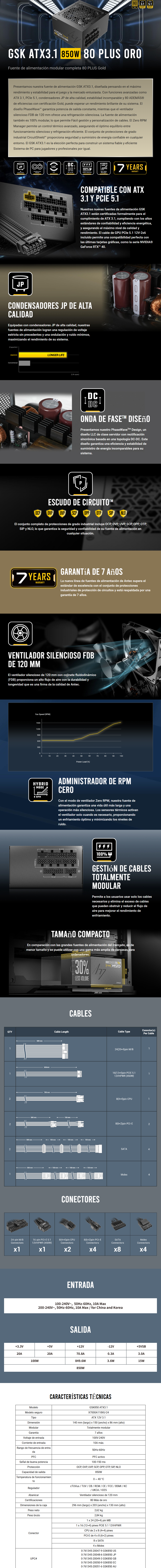 Fuente De Poder Antec GSK GOLD 850W – Full Modular, 80+ GOLD, 24 Pin, ATX 3.1, PCIe 5.1, PCI-e 6+2 Pin, EPS 4+4 Pin, PCI-E 16 12+4, 120mm, Negro