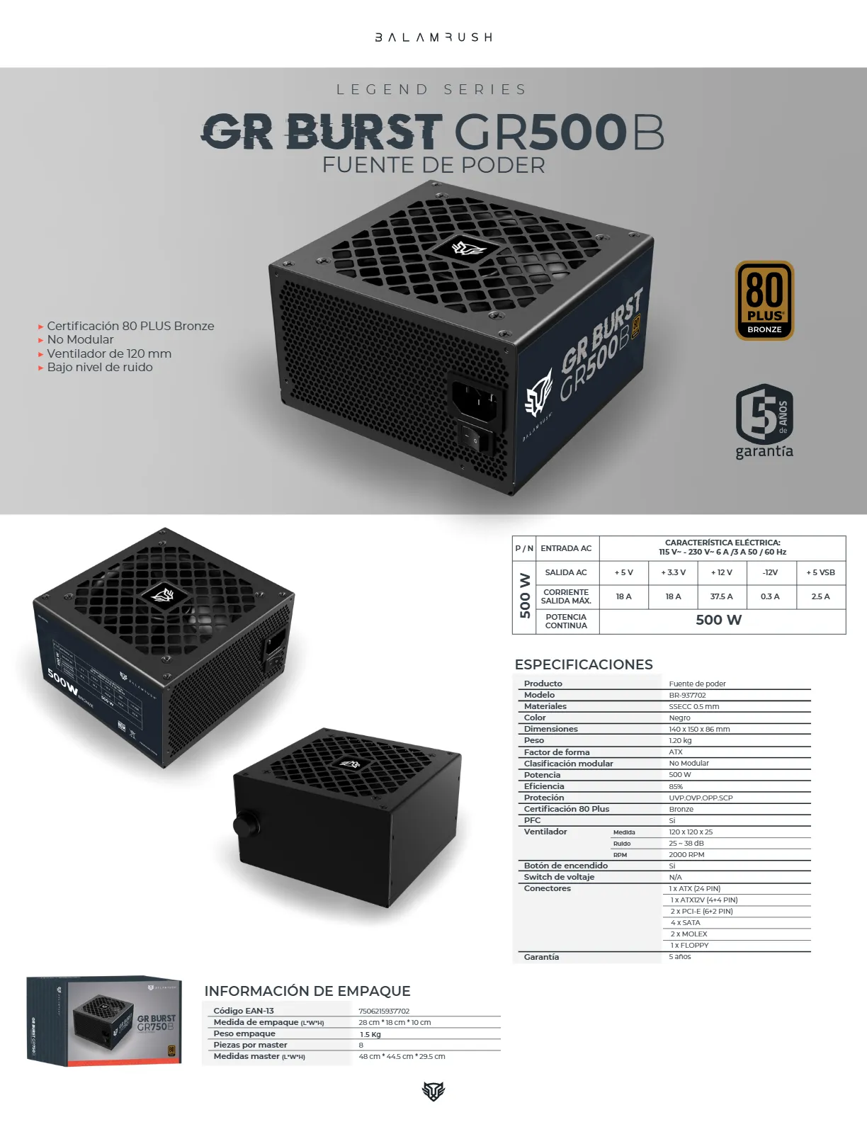 Sé el primero en valorar “Fuente de Poder BALAM RUSH GR BURST GR500B LEGEND SERIES / 500W / 80 Plus Bronce / No Modular / 20+4 Pin / CPU 4+4 / Pci-E 6+2 / Sata / Molex / Negro / BR-937702”
