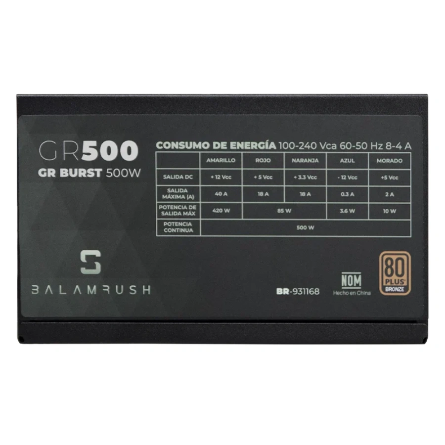Fuente de Poder BALAM RUSH GR BURST GR500B LEGEND SERIES / 500W / 80 Plus Bronce / No Modular / 20+4 Pin / CPU 4+4 / Pci-E 6+2 / Sata / Molex / Negro / BR-937702
