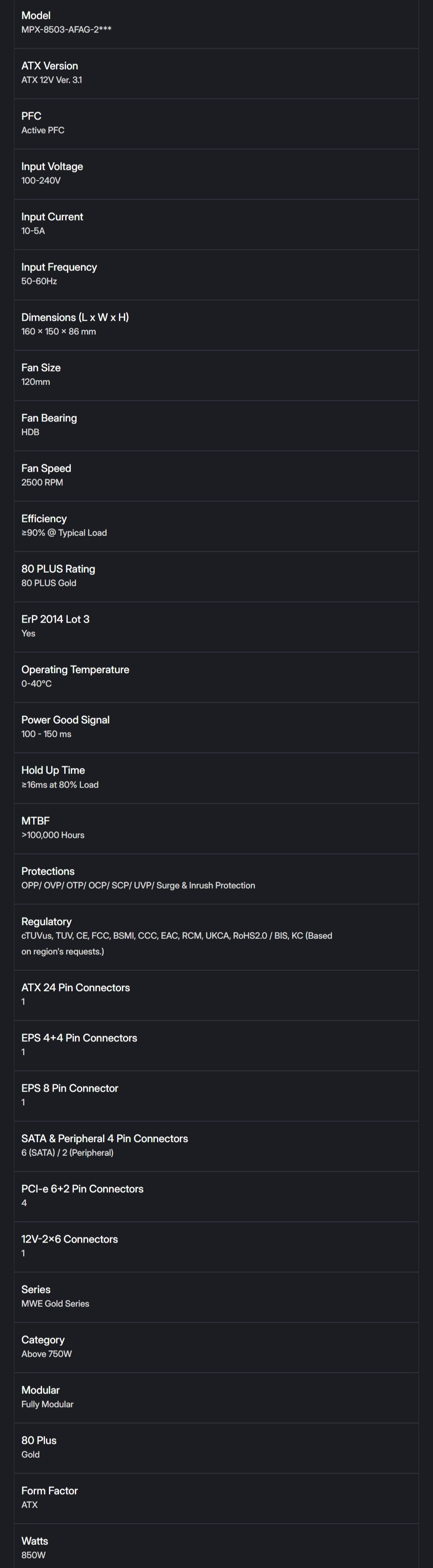 Fuente de Poder Cooler Master MWE GOLD 850 V3 – 850W, Modular, 80+ GOLD, 24 pin ATX, PCI-e 6+2 Pin, EPS 4+4 Pin, ATX 3.1, 120mm, Color Negro