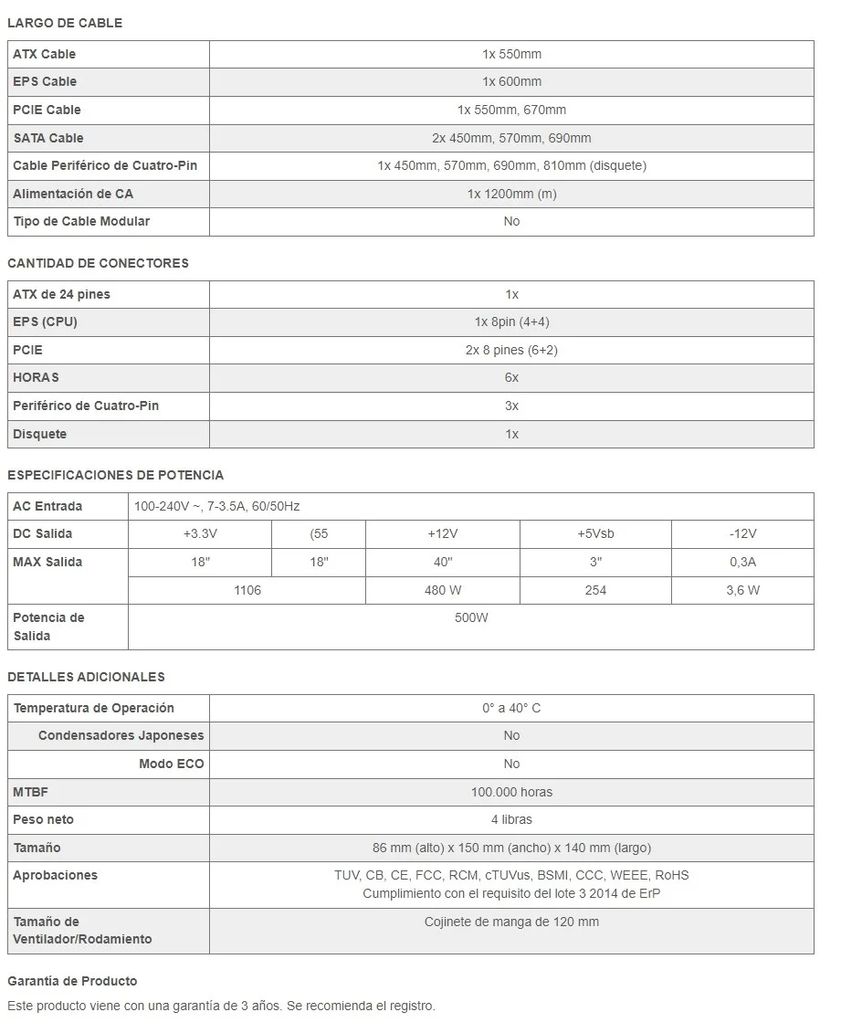 Fuente De Poder EVGA 500 W3 / 500W / 80 Plus White / ATX / 120mm / Sata / 24 Pines / Pci-E 6+2 / Cpu 4+4 / Negro