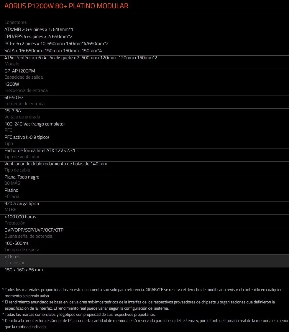 Fuente De Poder Gigabyte Aorus P1200w RGB / 1200w / Full Modular / x16 Sata / x6 Molex / Pci-e 6+2 x10 / Monitor Lcd / 80 Plus Platinum / Ventilador 140mm / Negro