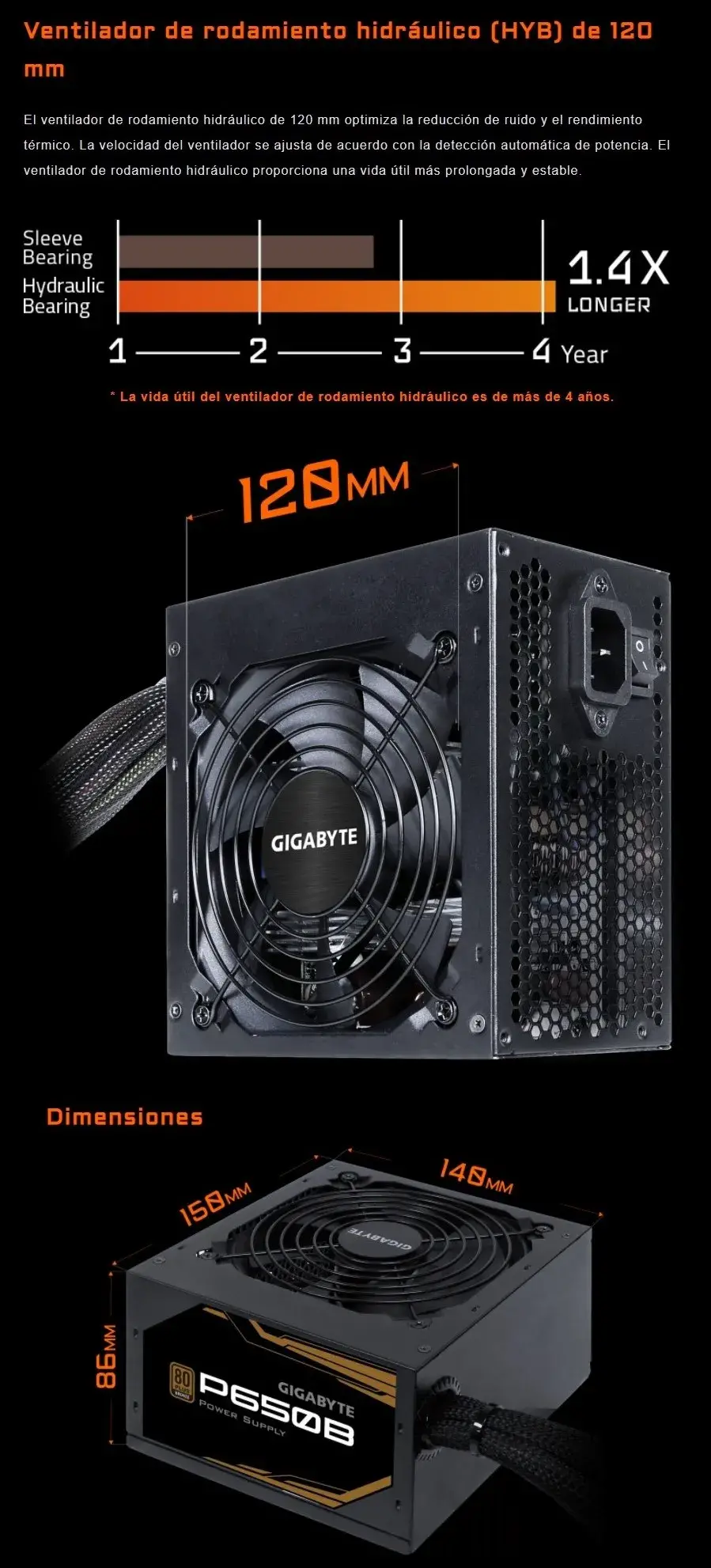 Fuente De Poder GIGABYTE P650b / 650W / 80 Plus Bronce / Capacitor Japonesa / 120MM / No Modular / Negro / Gp-P650b