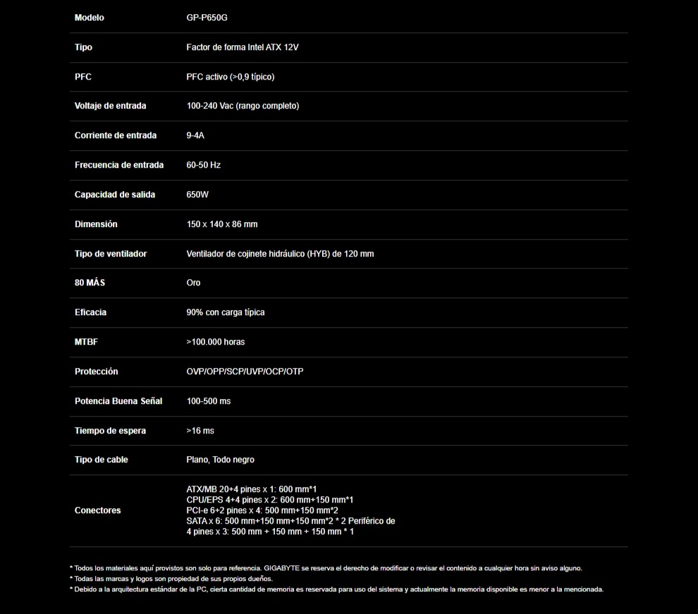 Fuente De Poder GIGABYTE P650G / 650W / 80plus Gold / 20+4 Pin / Cpu 4+4 / Pci-E 6+2 / Sata / Molex / Negro