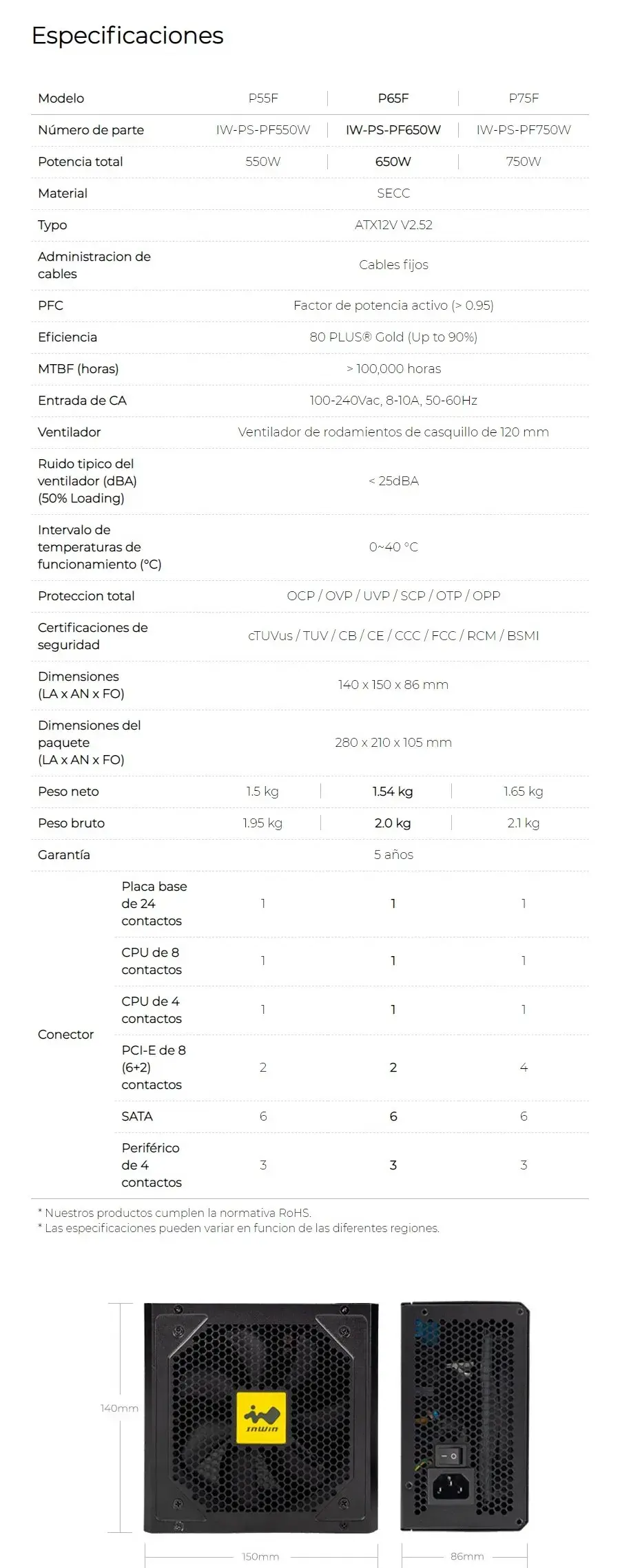 Sé el primero en valorar “Fuente De Poder In Win P65f Serie Pf / 650W / 80 Plus Gold / ATX / 12V / V2.52 / 1.5 Kg / 25DBA / 120MM / Negro”