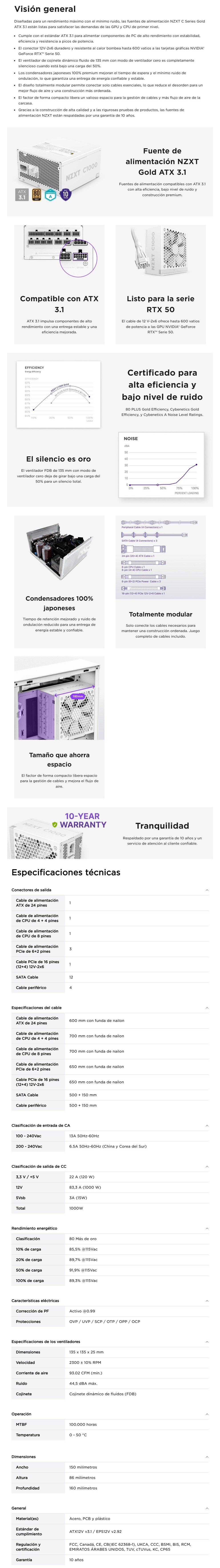 Fuente de Poder NZXT C1000 Gold 1000w – Full Modular, 80+ GOLD, 24 Pin, ATX 3.1, PCI-e 6+2 Pin, EPS 4+4 Pin, PCI-E 16 12+4, 120mm, Negro