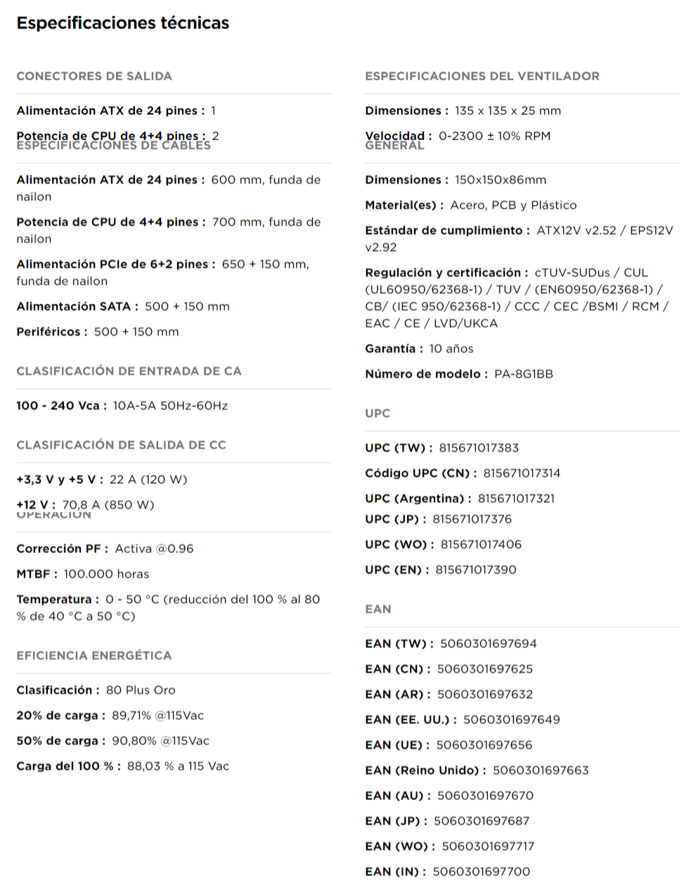 Esta fuente de alimentación ofrece 850 vatios de potencia limpia y estable, ideal para PC para juegos con múltiples GPU o requisitos de energía más altos. También es útil para compilaciones SLI o Crossfire.
