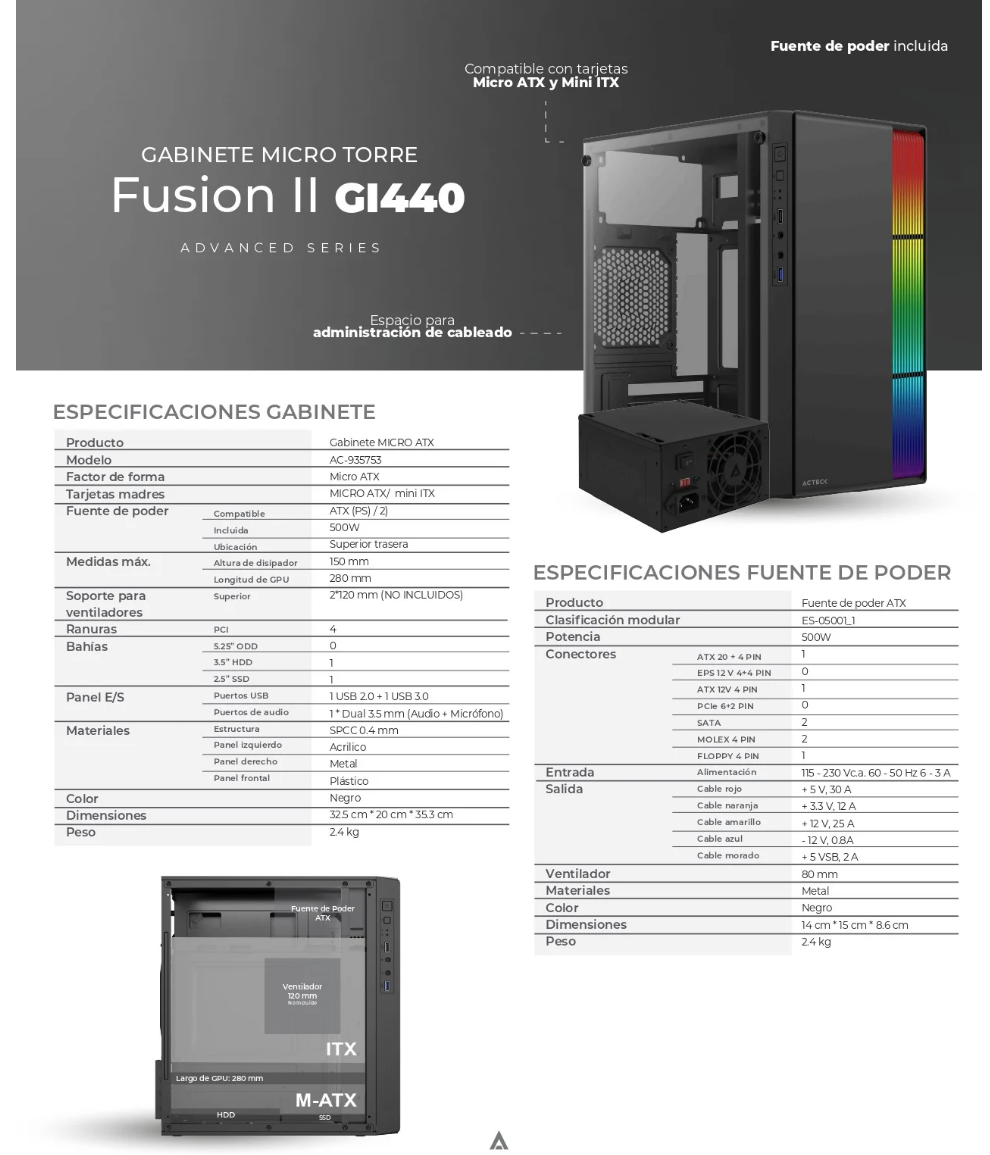 Gabinete ACTECK FUSION Ii Rgb / Micro-ATX / Ventana Lateral Acrílico / Usb 3.0, 2.0 / Incluye Fuente 500W / Negro
