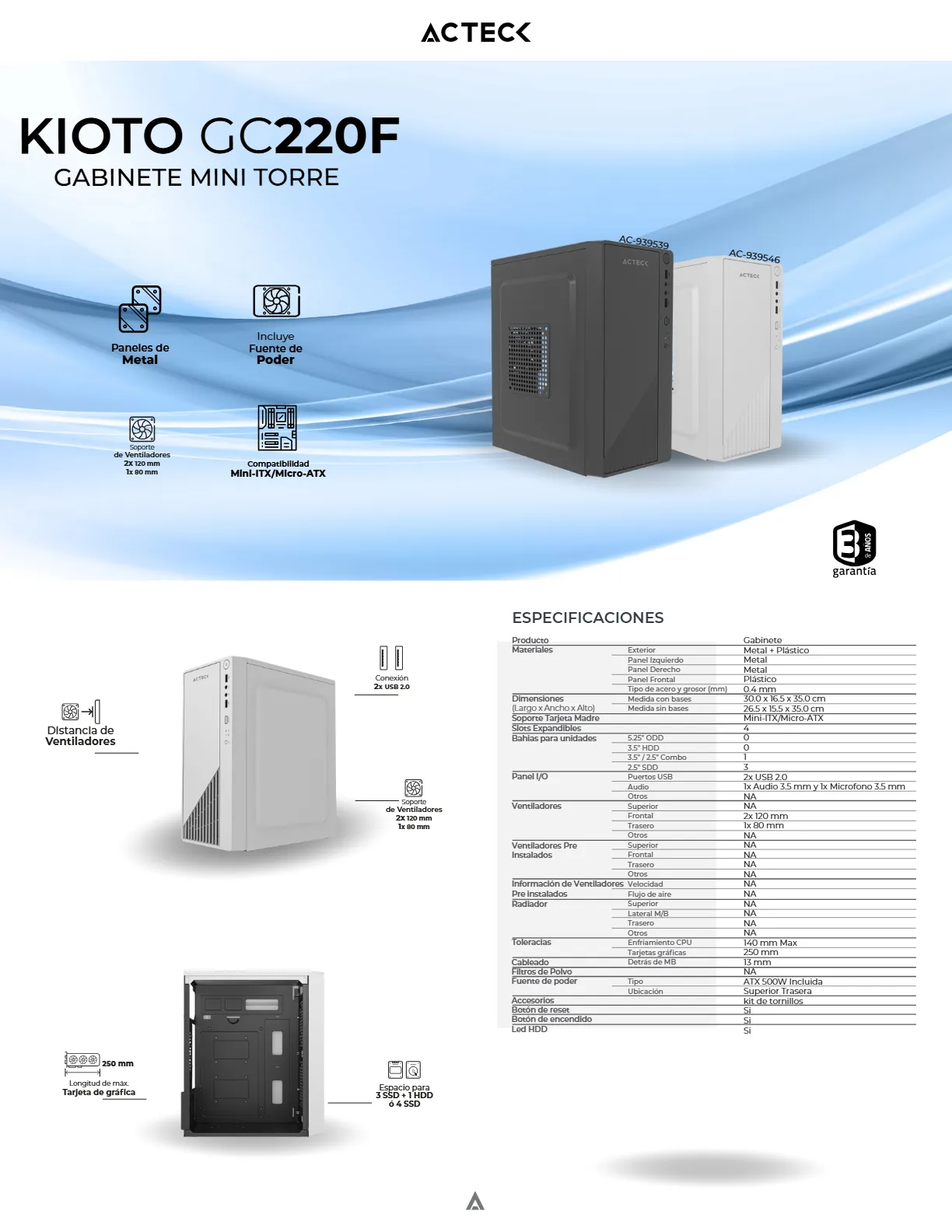 Con soporte para placas base Max MB M-ATX y una fuente de alimentación ATX de 500 W, este gabinete asegura un rendimiento estable y potente. Sus 2 puertos USB 2.0 proporcionan conectividad esencial para periféricos y dispositivos externos. Fabricado en un material completamente metálico y con un frente sólido, el Kioto GC220F ofrece una durabilidad superior y una protección óptima para los componentes internos.