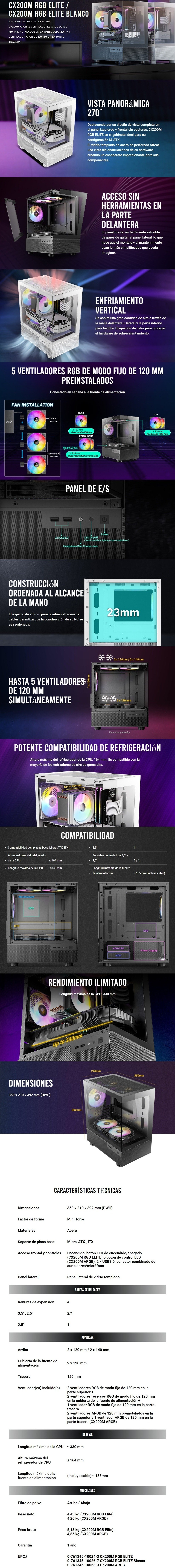 - Destacando por su diseño de vista completa en el panel izquierdo y frontal sin costuras, CX200M RGB ELITE es el gabinete ideal para su configuración M-ATX.