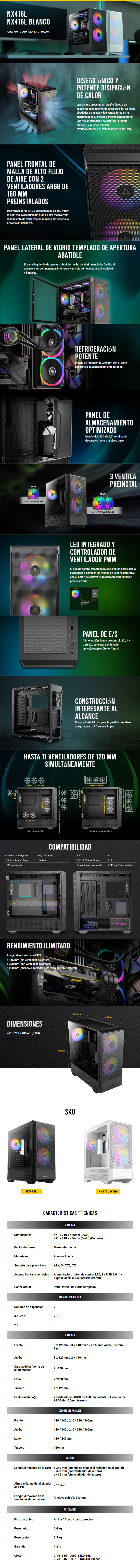 Gabinete ANTEC NX416L – ATX Mid Tower, Cristal Templado, 3 Vent. Incluidos, USB 3.0, Blanco