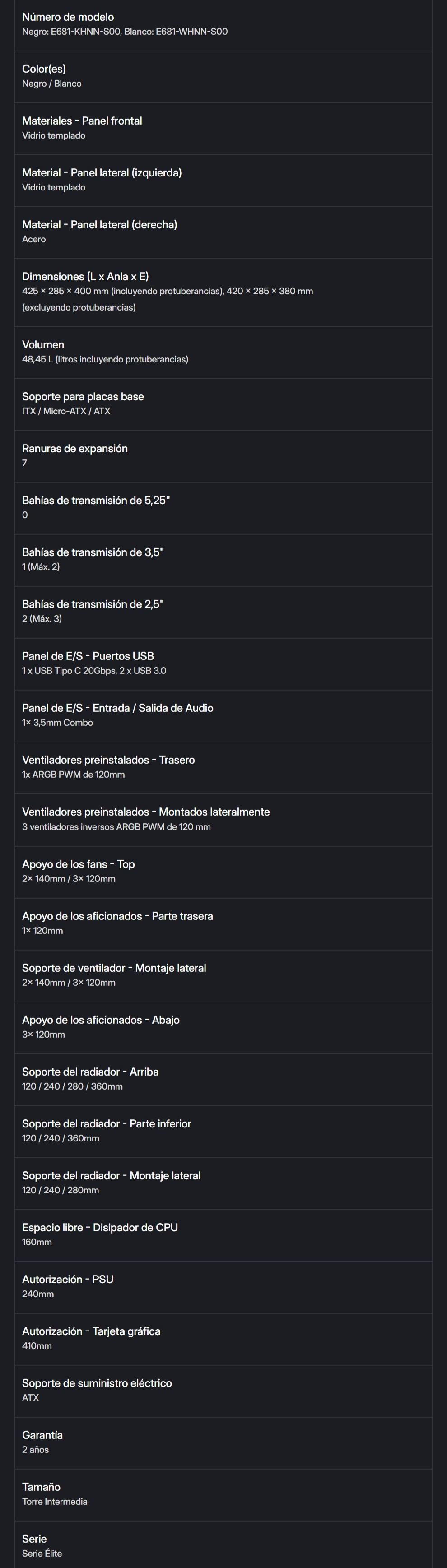 El Elite 681 redefine las construcciones de exhibición con sus paneles panorámicos de vidrio templado de 270° y su auténtica disposición de doble cámara. Diseñado para sistemas de alto rendimiento, combina una estética refinada con una ingeniería de flujo de aire de vanguardia. Desde soporte de refrigeración vertical hasta amplia compatibilidad con radiadores, esta caja está diseñada para manejar hardware de nueva generación con estilo y precisión.