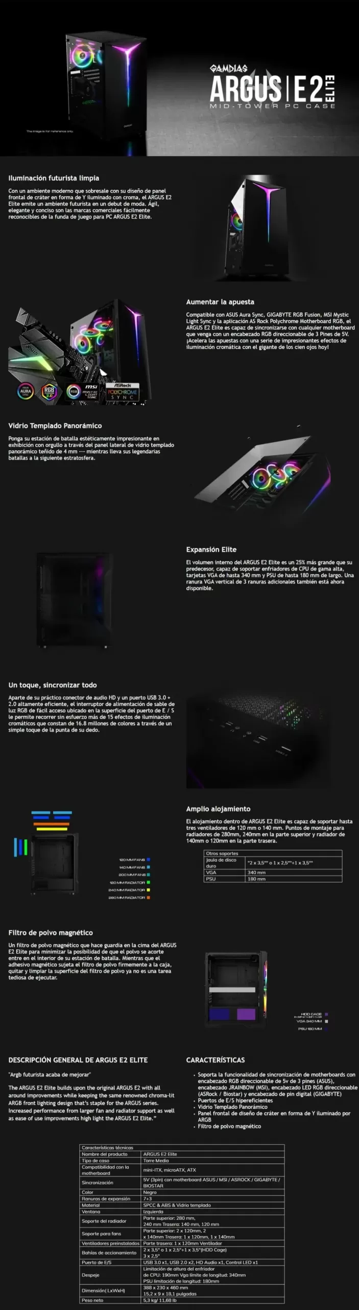 Gabinete GAMDIAS Argus E2 Elite / RGB / ATX, Micro-ATX, Micro-Itx / Cristal Templado / 1 Vent. Incluido / Negro