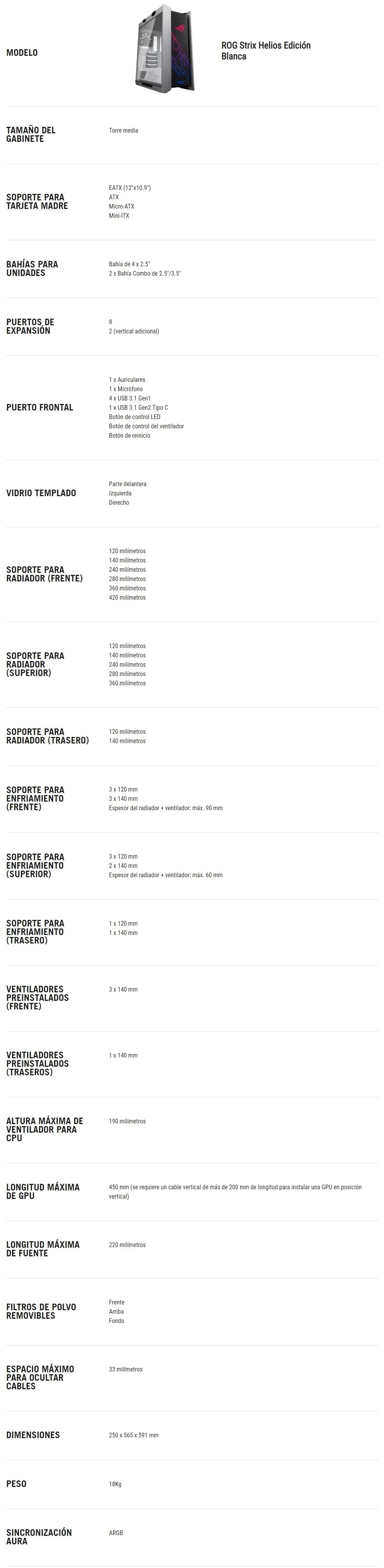 Gabinete Gamer ASUS ROG Strix Helios / E-ATX / Cristal Templado / No Incluye Ventiladores / USB 3.1, USB-C / Blanco