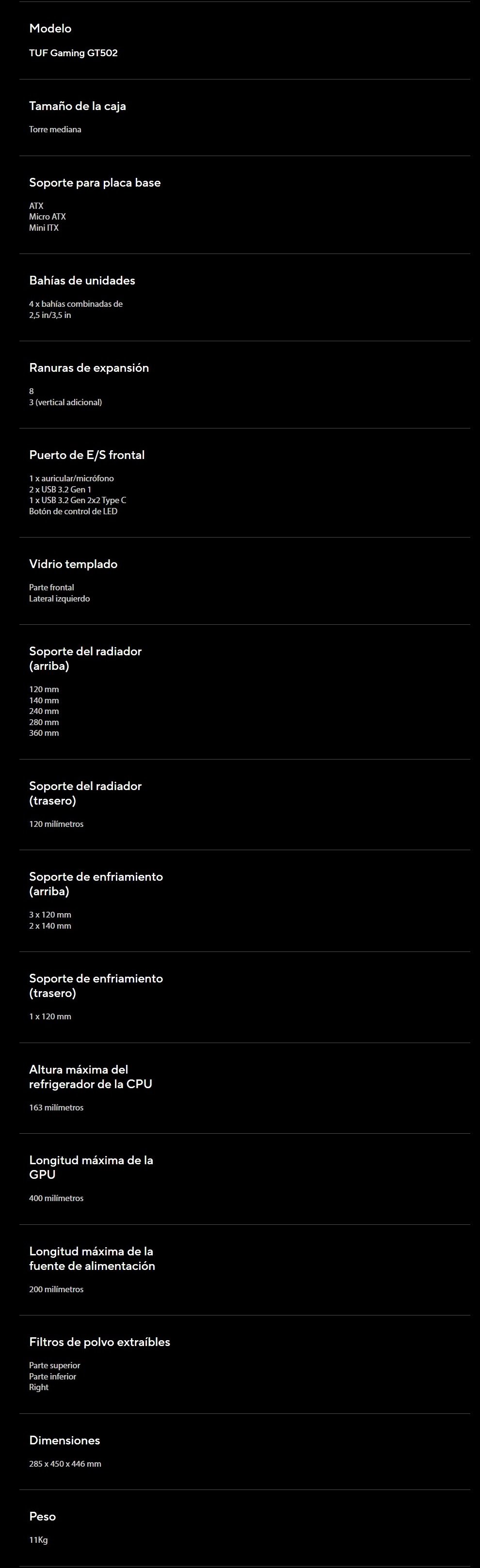 Gabinete Gamer ASUS TUF GAMING GT502 / ATX / Cristal Templado / No Incluye Ventiladores / USB 3.2, USB-C / Negro