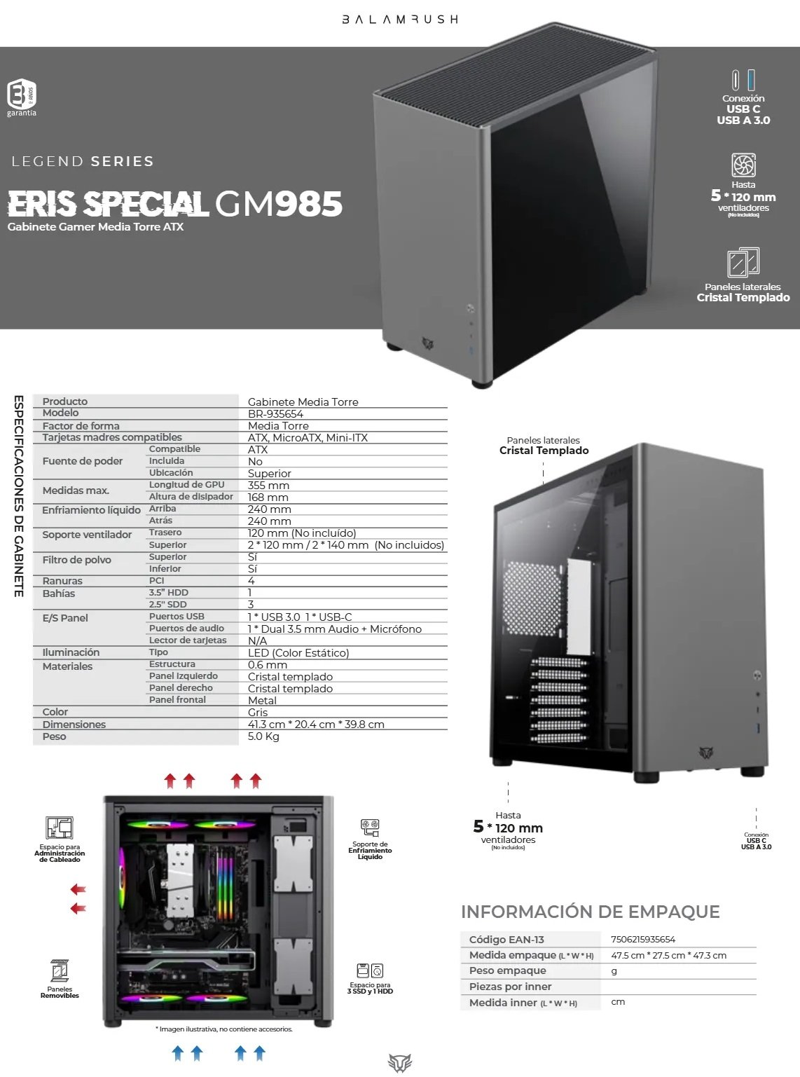• Diseñado para acomodar placas madre ATX, el Gabinete Gamer Media Torre Eris Special GM985 ofrece un amplio espacio para tus configuraciones más ambiciosas.