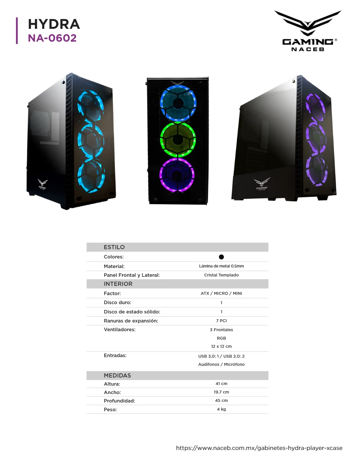 Gabinete Gamer NACEB HYDRA Crystal NA-0602 / Full ATX / Cristal Templado / 3 Ventiladores Incluidos / USB 3.0, USB 2.0 / Color Negro