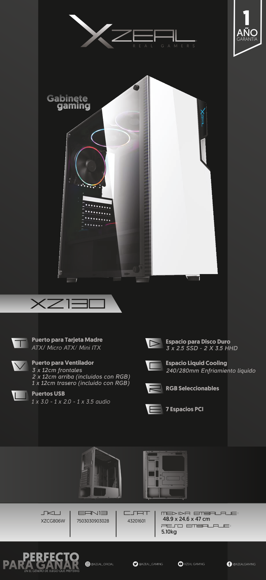 Gabinete Gamer Xzeal XZ130 / Atx, Micro Atx, Mini-itx / USB 3.0, 2.0 / Ventana Lateral / Led RGB / 3 Ventiladores RGB Incluidos / Negro