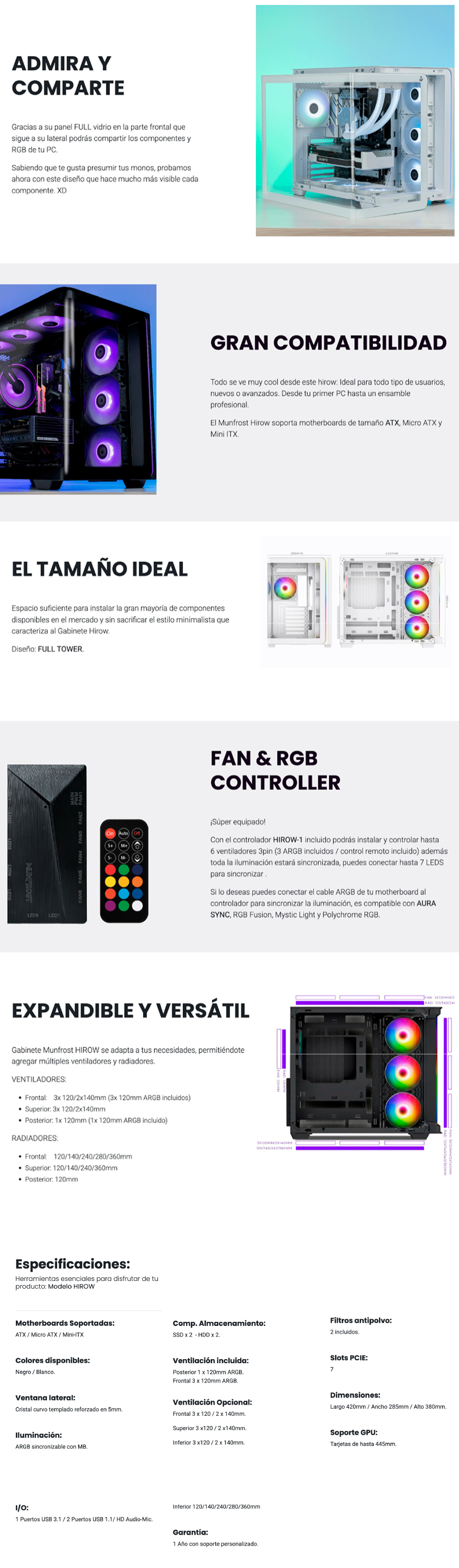 Gabinete MUNFROST Hirow Black – ATX, Cristal Templado, 4 Vent. Incluidos, USB 3.1, Blanco
