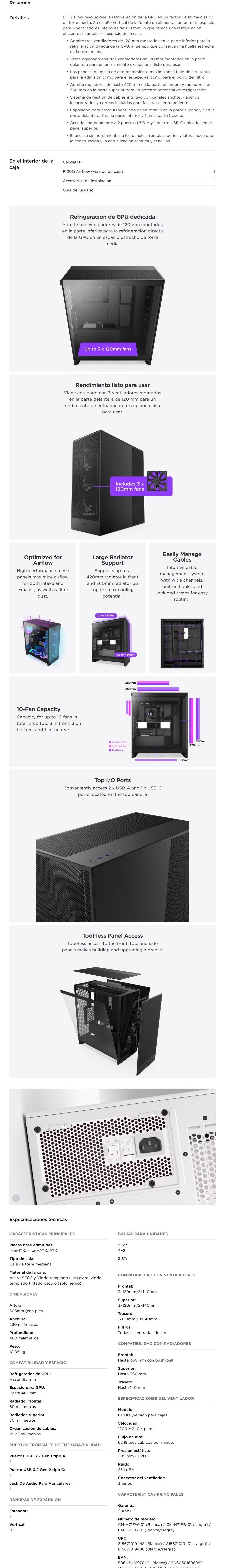 El H7 Flow revoluciona la refrigeración de la GPU en un factor de forma clásico de torre media. Su diseño vertical de la fuente de alimentación permite espacio para 3 ventiladores inferiores de 120 mm, lo que ofrece una refrigeración eficiente sin ampliar el espacio de la caja.
