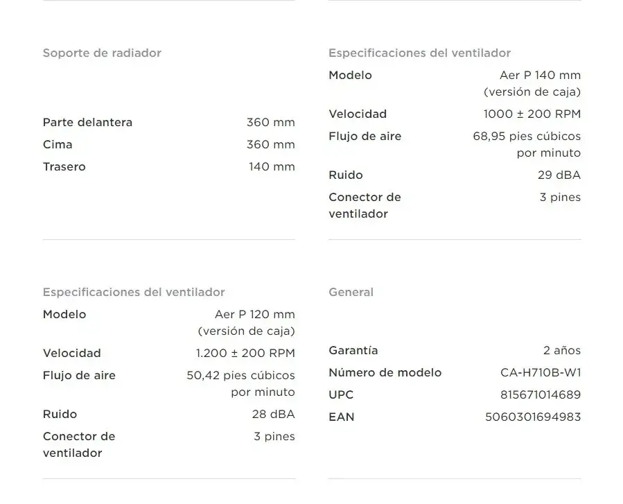 • Se incluyen cuatro ventiladores Aer F120mm * para un flujo de aire interno óptimo y el panel frontal. Las entradas de la fuente de alimentación incluyen filtros extraíbles.