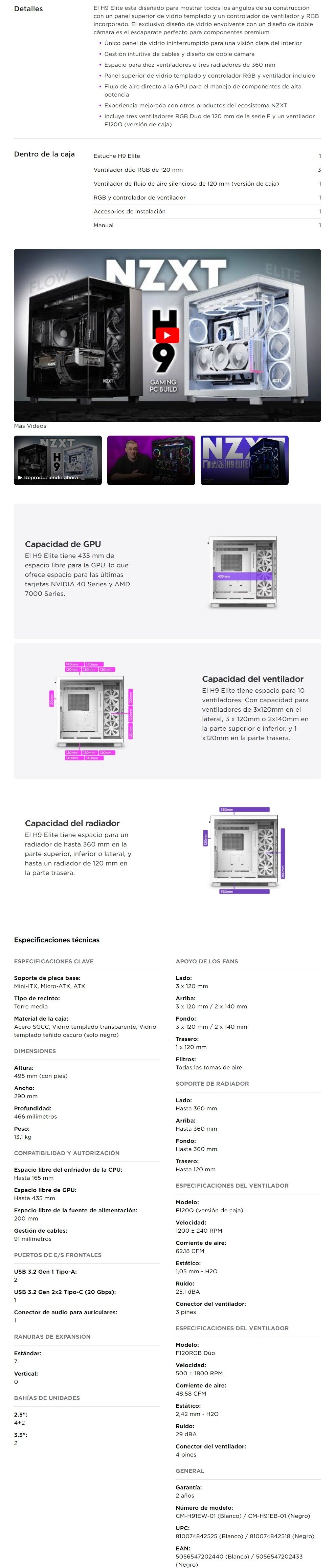 Gabinete NZXT H9 Élite / Torre Media / ATX / Ventana Lateral Cristal Templado / Incluye 4 Ventiladores / USB 3.2, USB-C 3.2, 3.5mm / Blanco