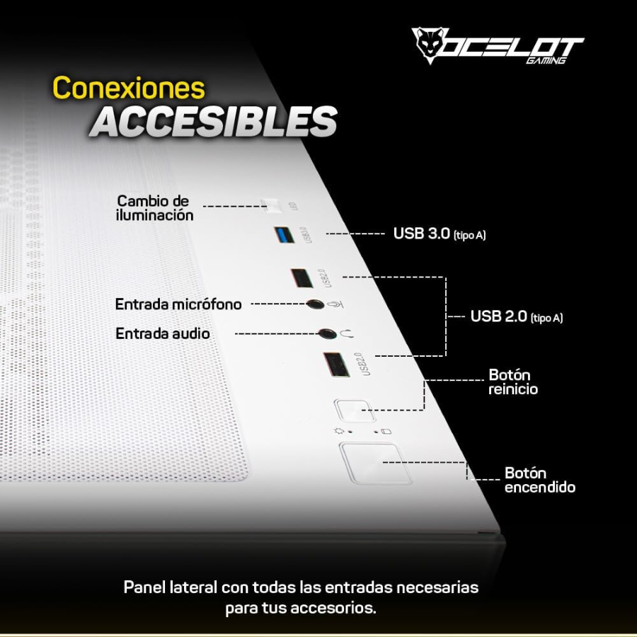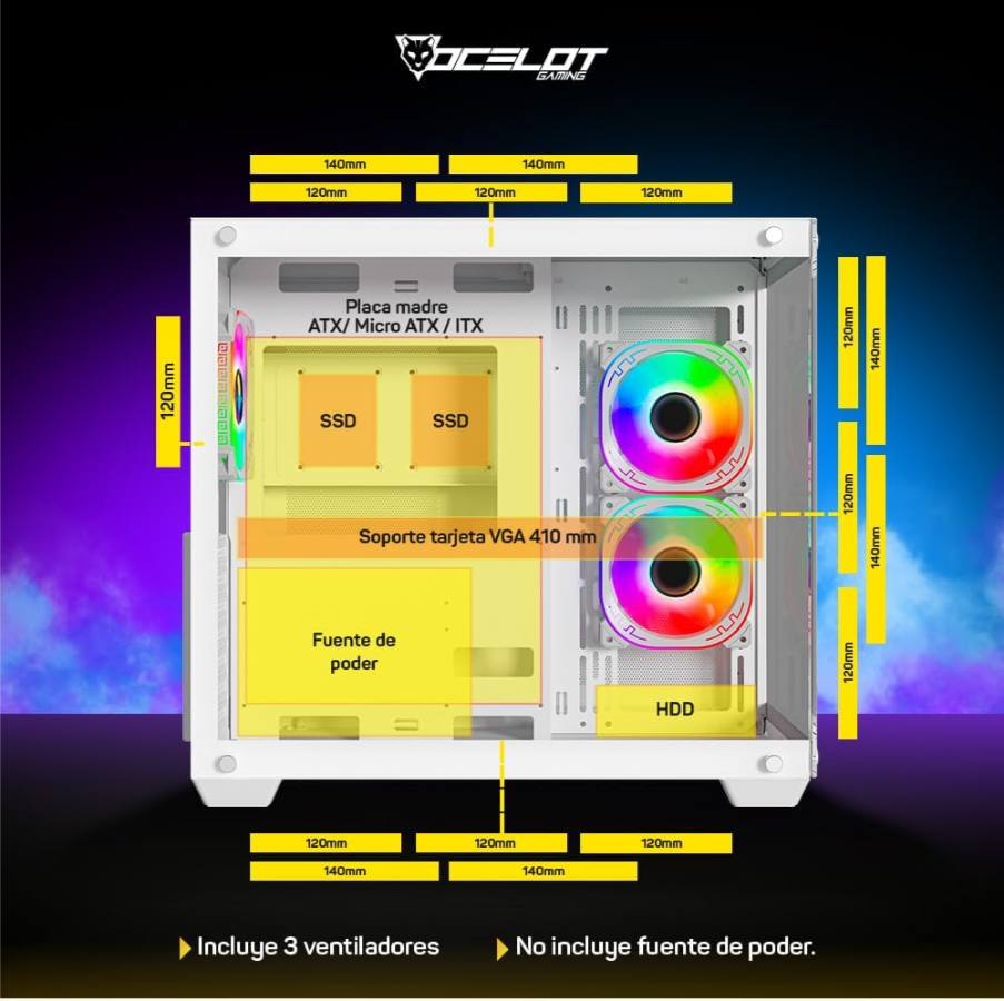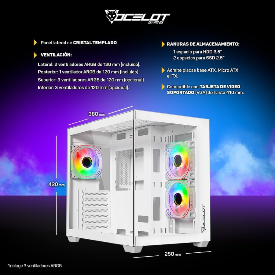 Gabinete OCELOT Gaming A-CUBE 1 – ATX, Cristal Templado, 3 Vent. Incluidos, USB 3.0, Color Blanco