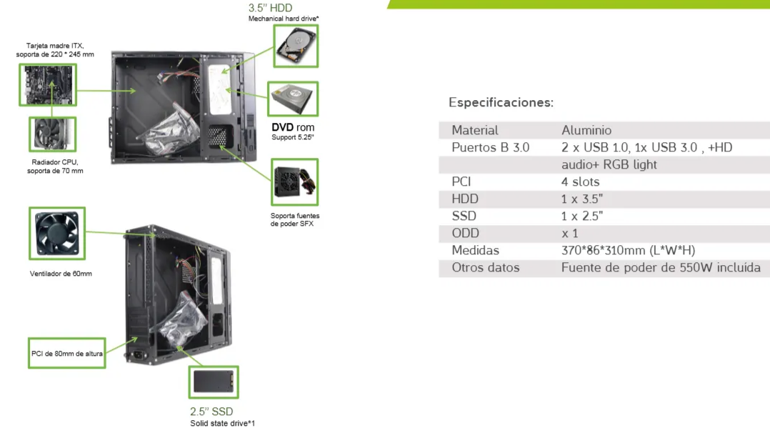 El Gabinete Stylos Mini-Tower ITX 550W Ventilador STGAKL1B es una opción ideal para quienes buscan un diseño compacto y funcional. Este gabinete soporta tamaños de disco duro de 2.5 y 3.5 pulgadas, permitiendo la instalación de hasta cuatro unidades de almacenamiento. La caja combina HDD y SSD, lo que proporciona flexibilidad en la configuración del sistema.