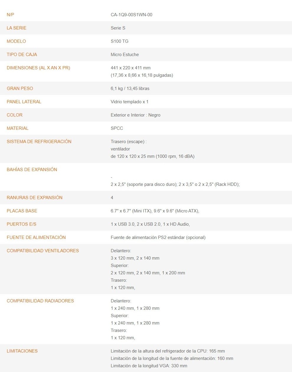 La caja S100 TG Micro viene con un panel de vidrio templado a la izquierda, un ventilador estándar preinstalado de 120 mm en la parte trasera y admite placas base de hasta Micro-ATX.
