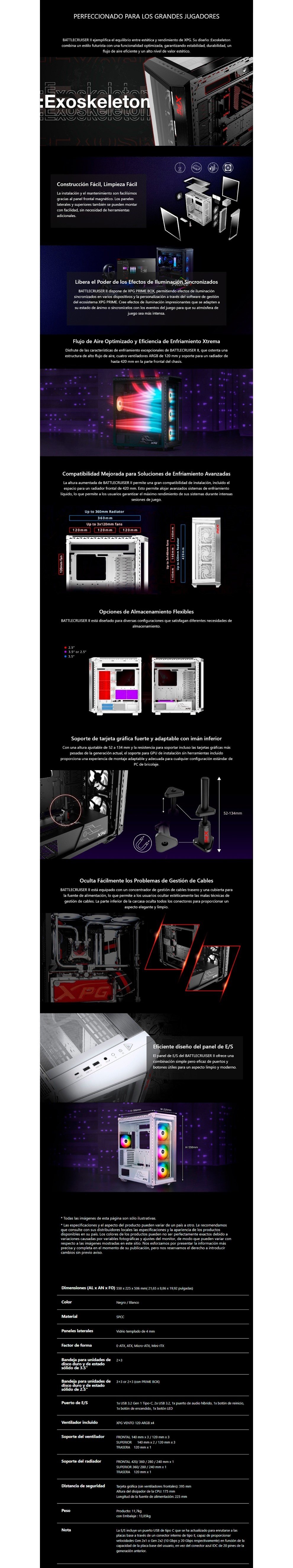 Gabinete XPG Battlecruiser II / E-ATX / 4 Ventiladores Incluidos / Cristal Templado / USB 3.2, USB-C, 3.5 mm / Blanco
