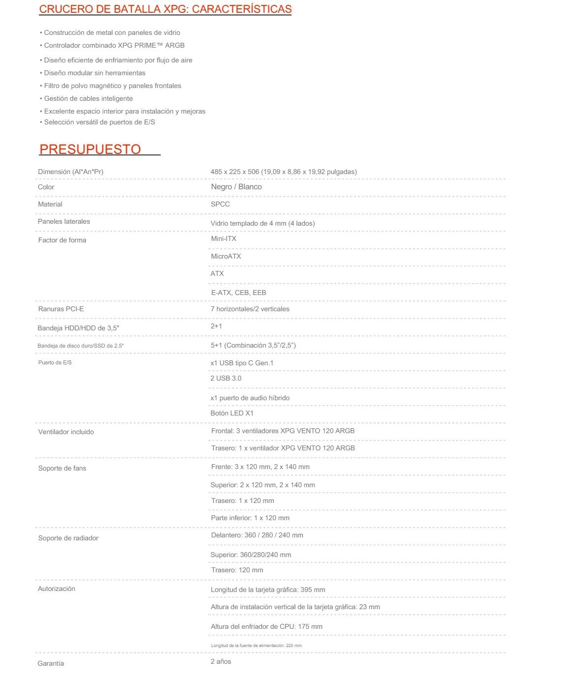 Gabinete XPG BATTLECRUISER / Media Torre / E-ATX / Ventana De Vidrio Templado / 4 Ventiladores ARGB Incluidos / USB C, USB 3.0, 3.5mm / Blanco
