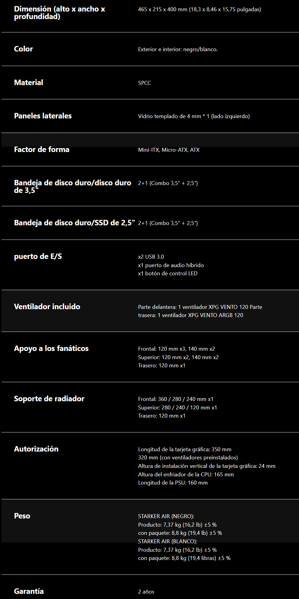 Gabinete XPG STARKER AIR ARGB / ATX / Vidrio Templado / 2 Ventiladores Incluidos / USB 3.0 / Blanco