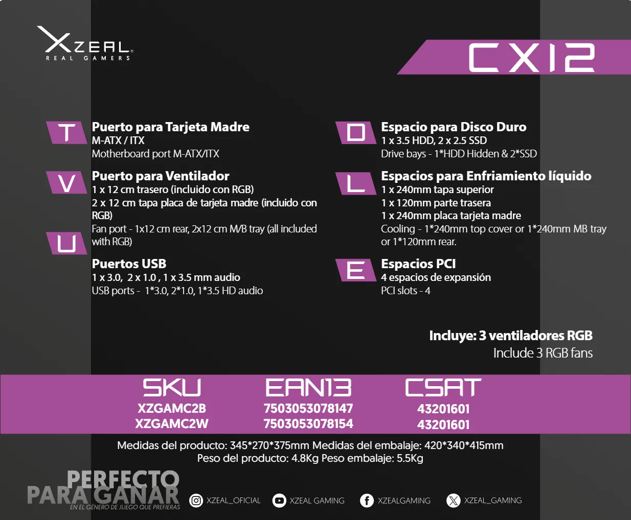 Diseño moderno y optimizado para configuraciones de alto rendimiento. Compatible con tarjetas madre M-ATX e ITX, incluye 3 ventiladores RGB para una ventilación eficiente y una estética gaming impactante. Espacio para almacenamiento con 1 HDD de 3.5” oculto y 2 SSD de 2.5”