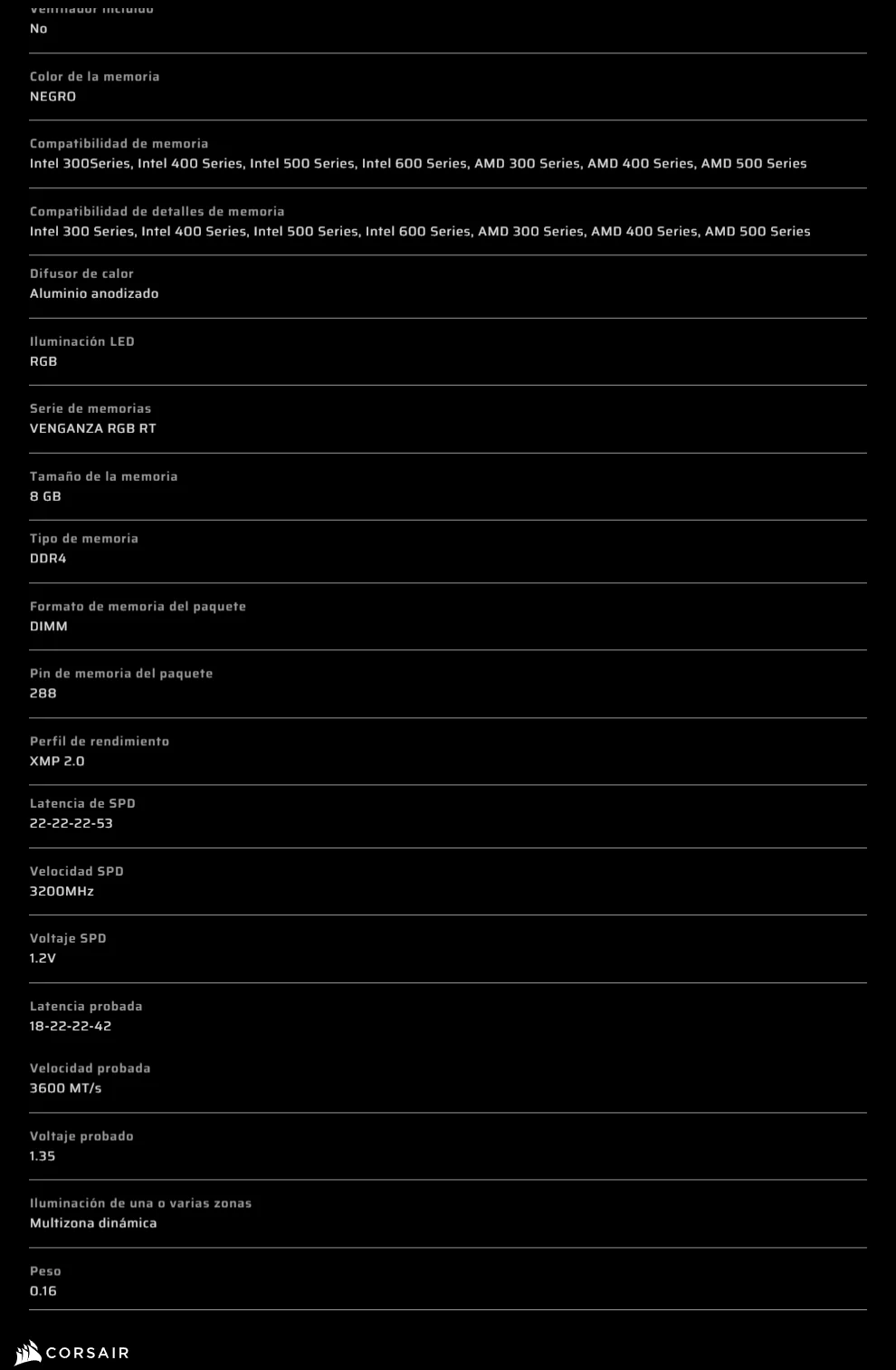 Sé el primero en valorar “Kit De Memoria RAM CORSAIR VENGEANCE RGB RT 16GB 2x8GB / DDR4 3600MHz* OC / DIMM / XMP 2.0 / CL18 / Negro”
