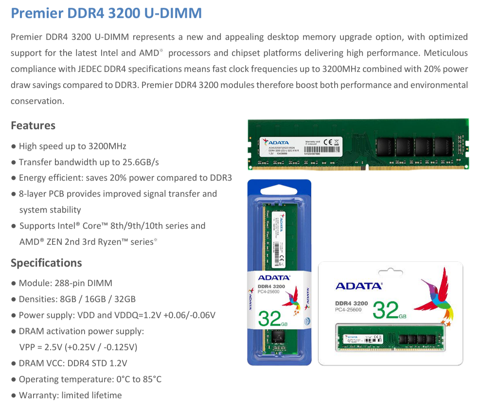Memoria RAM Adata – 32GB, DDR4 3200MHz, CL22, 1.2V, DIMM – Verde