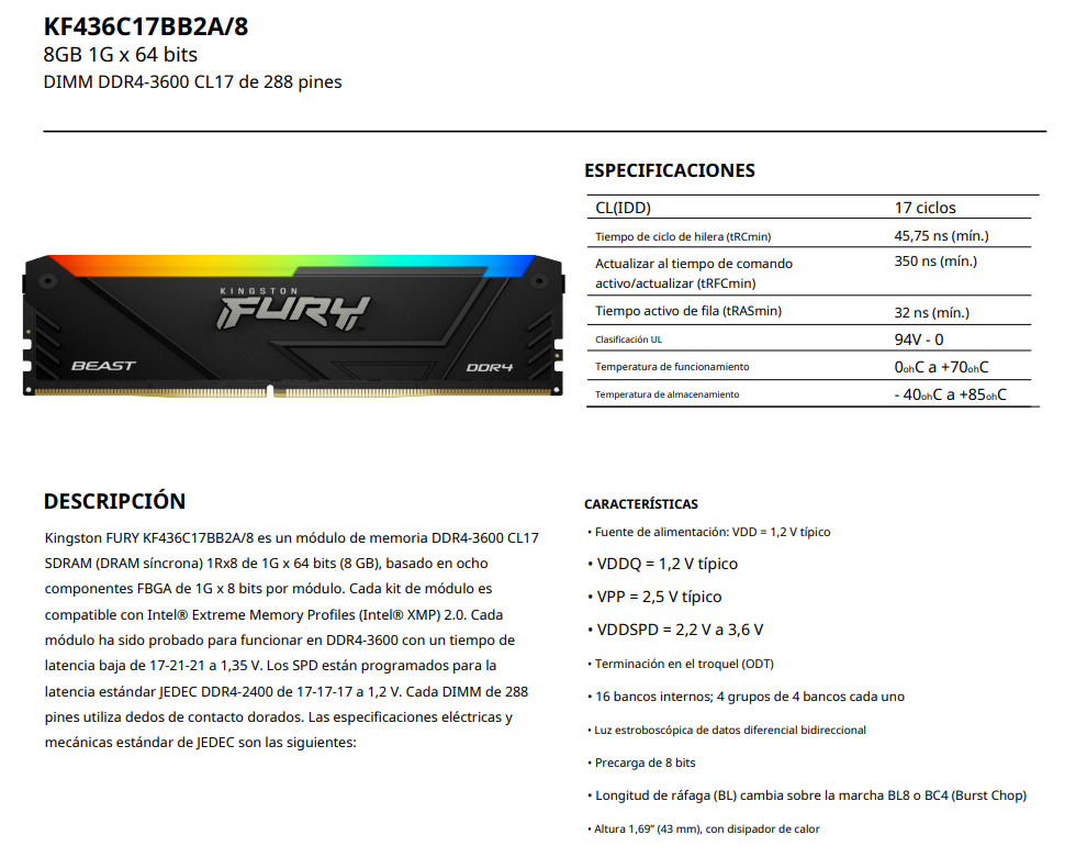 Memoria RAM KINGSTON Fury Beast Rgb / 8GB / DDR4 3600MHz* OC / CL17 / Negro