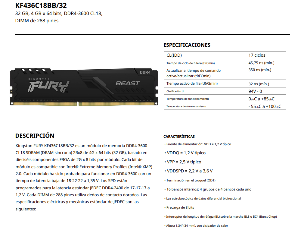 Kingston FURY KF436C18BB/32 es un módulo de memoria DDR4-3600 CL18 SDRAM (DRAM síncrona) 2Rx8 de 4G x 64 bits (32 GB), basado en dieciséis componentes FBGA de 2G x 8 bits por módulo. Cada kit de módulo es compatible con Intel® Extreme Memory Profiles (Intel® XMP) 2.0.
