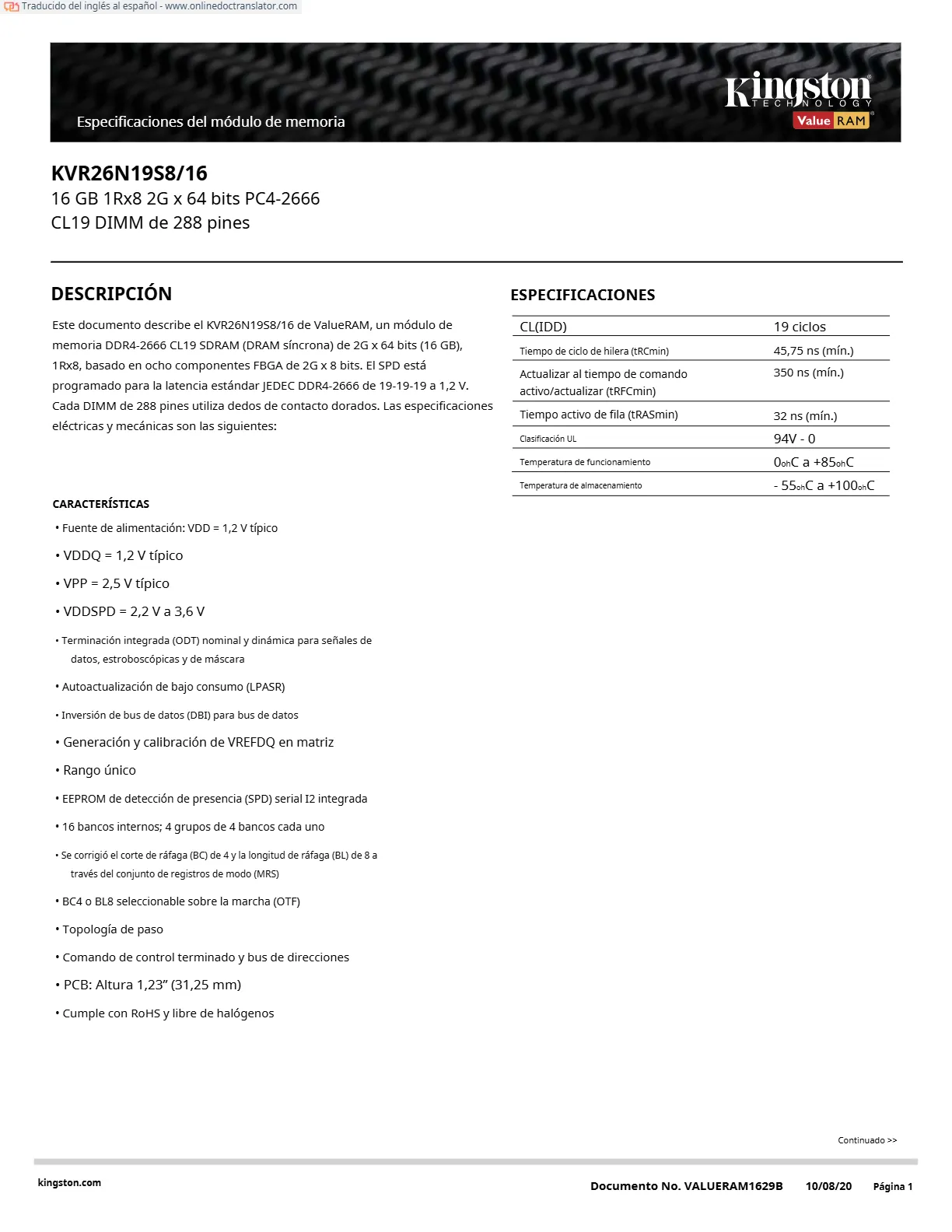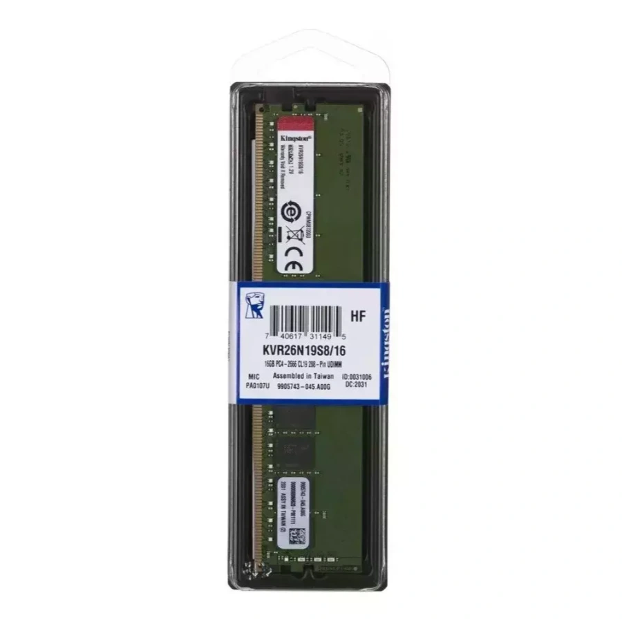 • La memoria RAM Kingston ValueRAM modelo KVR26N19S8/16 es un componente diseñado para su uso en PC y servidores.