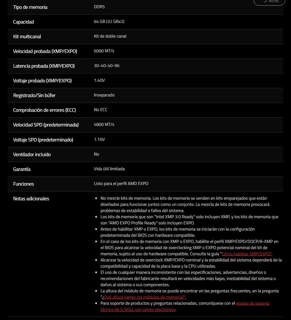 • Marca: G.Skill, Serie: Trident Z5 NEO, modelo: F5-6000J3040G32GX2-TZ5N