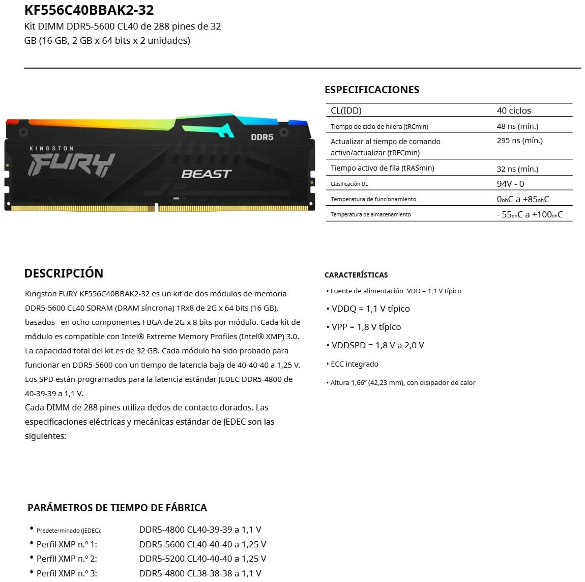 Kit De Memoria RAM KINGSTON FURY BEAST KF556C40BBAK2-32 RGB