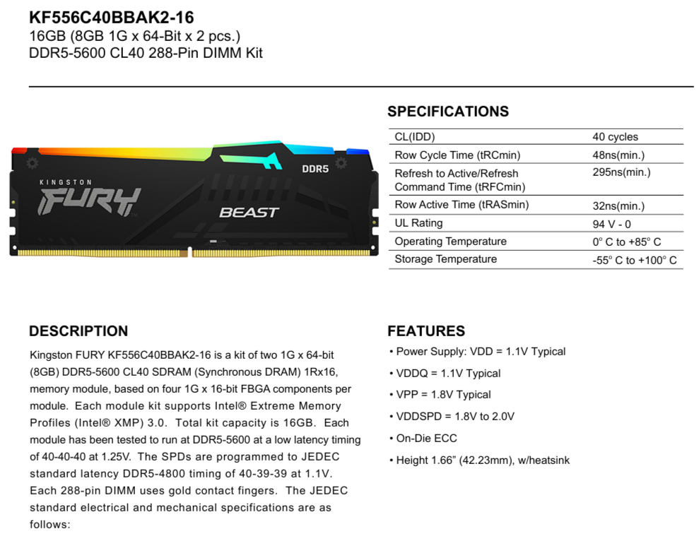 Kit Memoria RAM KINGSTON FURY Beast RGB – 16GB 2X8GB, DDR5 5600MHz, CL40, 1.25V, DIMM, Negro