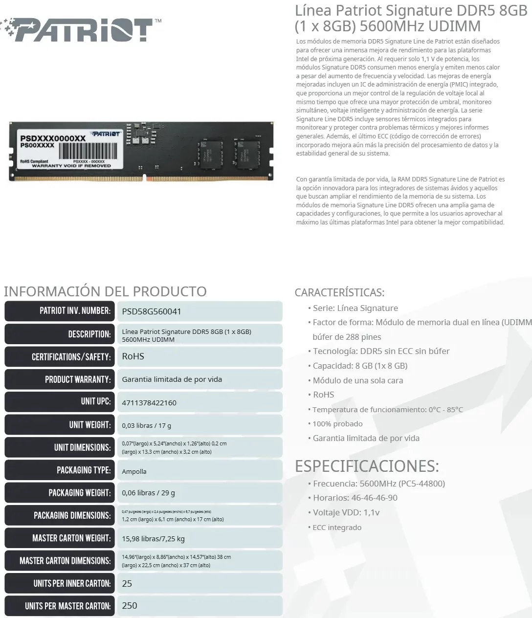 Memoria RAM PATRIOT Signature Line PSD58G560041
